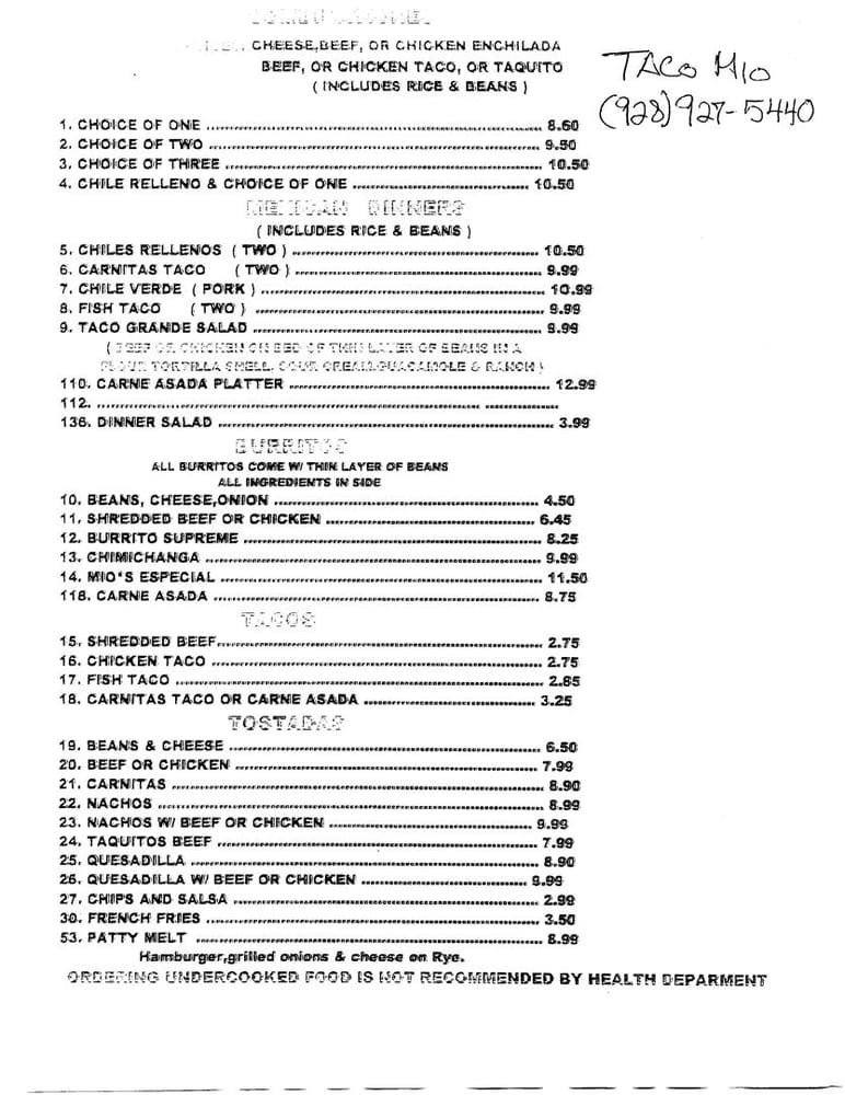 At Taco Mio, we celebrate the vibrant richness of Mexican cuisine in a cozy, welcoming spot in Quartzsite, AZ. Our journey began with a passion for authentic flavors and a commitment to quality, bringing together diverse dishes like the tantalizing fish tacos and savory chili rellenos. The casual ambiance, adorned with tangerine walls and Mexican art, offers the perfect backdrop for groups and families alike. We pride ourselves on excellent service and a menu that caters to everyone, including vegetarian options. Join us for a delightful meal, whether you're dining in or enjoying takeout, and discover why Taco Mio feels like home.